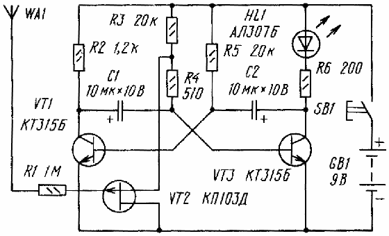 Если нажата кнопка выключателя SB1, но электрического поля в зоне антенного щупа WA1 нет либо искатель находится далеко от сетевых проводов, транзистор VT2 открыт, мультивибратор не работает, светодиод HL1 погашен.
