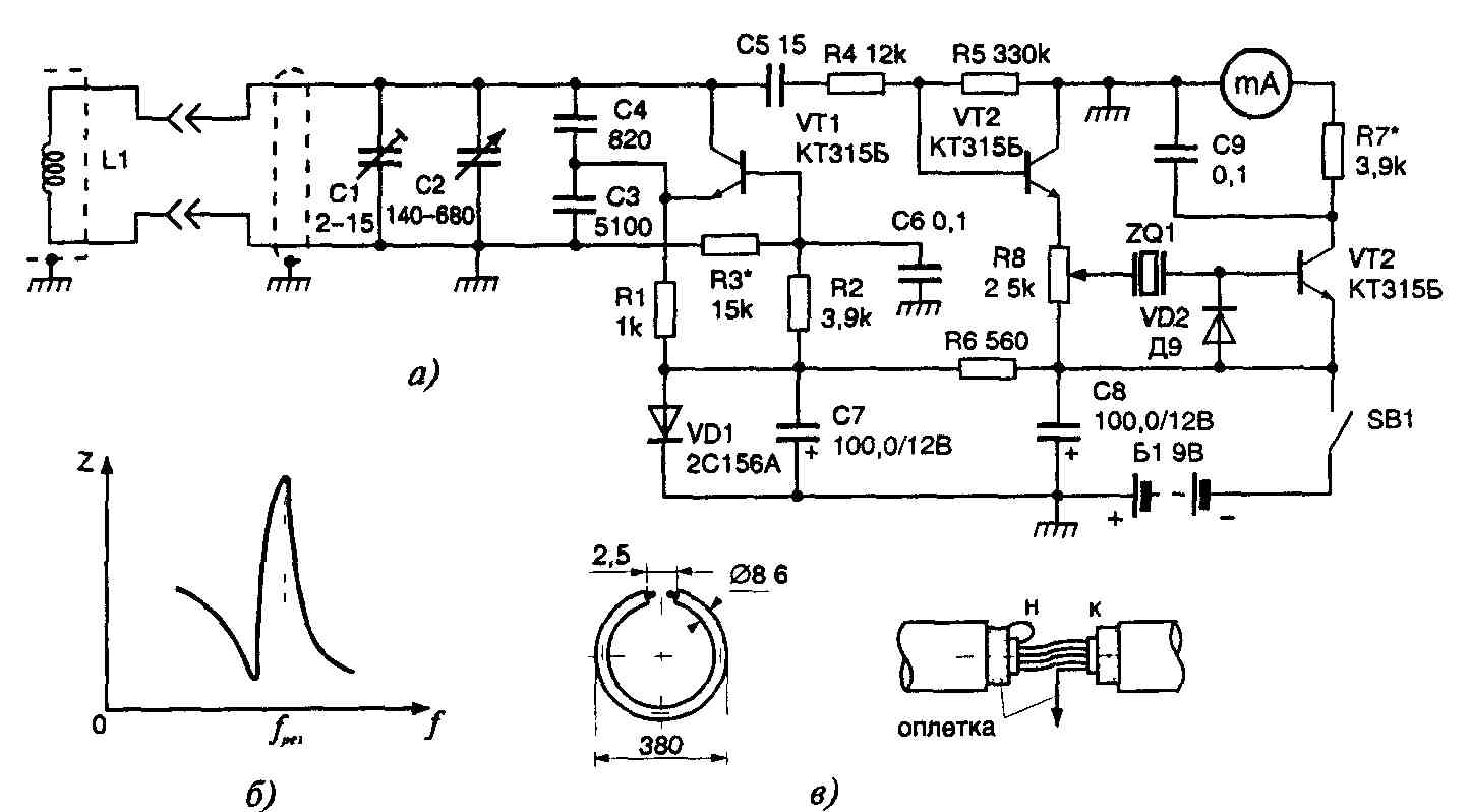 Металлоискатели, основанные на регистрации на биений, оказываются малочувствительными при поисках металлов со слабыми ферромагнитными свойствами, таких как, например, медь, олово, серебро. Повысить чувствительность металлоискателей этого типа невозможно, поскольку разность частот биения малозаметна при обычных методах индикации. Значительный эффект дает применение кварцованных металлоискателей. Металлоискатель, принципиальная схема которого приведена на рис. 4.17, а, состоит из измерительного генератора, собранного на транзисторе VT1, и буферного каскада - эмиттерного повторителя, собранного на транзисторе VT2, отделенных кварцевым резонатором ZQ1 от индикаторного устройства — детектора на диоде VD2 с усилителем постоянного тока на транзисторе VT3. Нагрузкой усилителя служит стрелочный прибор с током полного отклонения 1 мА.