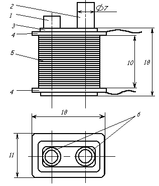 Катушка L1 представляет собой прямоугольную рамку размерами 175х230 мм, состоящую из 32 витков провода ПЭВ-2 0.35 (подойдет провод ПЭЛШО 0.37). Конструкция катушки L2 показана на рисунке. В двух бумажных цилиндрических каркасах 6 размещены отрезки стержня диаметром 7 мм из феррита 400НН или 600НН: один (1) длинной 20...22мм, закрепленный постоянно, другой (2)-35...40мм (подвижный- для подстройки катушки). Каркасы обернуты бумажной лентой 3, поверх которой намотана катушка L2 (5)-55 витков провода ПЭЛШО (можно ПЭВ-1 или ПЭВ-2) диаметром 0,2мм. Выводы катушки закреплены резиновыми колечками 4.