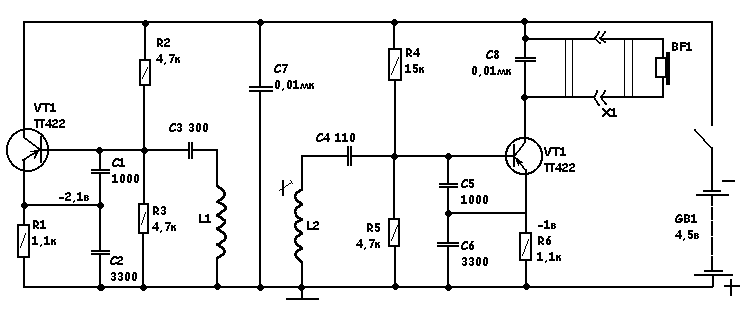 Колебательный контур приемника индуктивно связан с контуром генератора, поэтому в коллекторной цепи транзистора VT2 протекают токи частотой обоих генераторов, а также ток разностной частоты, иначе говоря, частоты биения. Если, к примеру, частота основного генератора 460 кГц, а частота генератора приемника 459 кГц, то разностная составит 1кГц, т. е. 1000Гц. Этот сигнал и слышен в телефонах. Но стоит приблизить поисковую катушку L1 к металлу, как частота звука в телефонах изменится- в зависимости от вида металла она или понизится, или станет выше. |