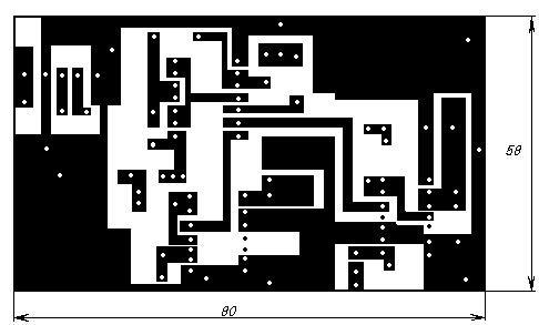 Монтажную плату и источник питания лучше разместить в металлическом корпусе подходящих размеров, например, спаянном из пластин фольгированного тексталита. Если корпусом будет служить пластмассовая коробка, то по краям платы, а так же в местах, обозначенных на рис. штриховыми линиями, надо вертикально припаять полоски фольги шириной 7...10 мм.