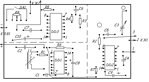Бывает, что достигнуть этого не удается. Причиной тому могут быть неполадки в компараторе. В таком случае надо проверить работоспособность остальной части устройства- к выходу элемента DD3.1 подключить высокоомный телефон (например ТОН-2) и тем же подстроечником катушки L1 добиться звукового сигнала. В противном случае придется искать ошибку в монтаже генераторов или неисправные детали.