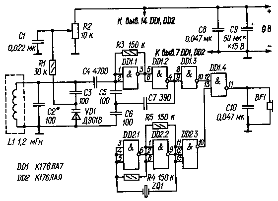Принцип действия описываемых ниже приборов основан на сравнении значений частоты колебаний двух генераторов: образцового и перестраиваемого, изменяющего частоту под действием на его колебательный контур искомого металлического предмета. По сравнению с другими известными методами - мостовым (регистрируется разбаланс измерительного моста, в одно из плеч которого включена поисковая катушка), сдвига фаз (измеряется фазовый сдвиг колебаний образцового и перестраиваемого генераторов), передатчик-приемник (регистрируется переизлучаемая предметом РЧ энергия) - метод сравнения значений частоты (иными словами, метод биений) менее эффективен, однако более прост в реализации. Построенные с его использованием металлоискатели компактны, не требуют тщательной настройки и мер по жесткой стабилизации частоты, неприхотливы в эксплуатации, благодаря чему и получили широкое распространение. Предлагаемые вниманию читателей устройства выполнены на доступной элементной базе и могут быть с успехом использованы в строительстве, коммунальном хозяйстве для поиска скрытых под слоем земли, мусора или снега люков и крышек колодцев, решеток водостока и т.д. Металлоискатель, принципиальная схема которого изображена на рис. 1 (вариант 1), собран всего на одной микросхеме К176ЛП2. Один из ее элементов (DD1.1) использован в образцовом генераторе, другой (DD1.2) - в перестраиваемом. Колебательный контур образцового генератора состоит из катушки L1 и конденсаторов С1, С2, перестраиваемого - из поисковой катушки L2 и конденсатора С4; первый перестраивают переменным конденсатором С1, второй - подборкой конденсатора С4. На элементе DD1.3 выполнен смеситель колебаний с образцовой и переменной частотами. С нагрузки этого узла - переменного резистора R5 - сигнал разностной частоты поступает на вход элемента DD1.4, а усиленное им напряжение ЗЧ - на головные телефоны BF1. Прибором можно обнаружить пятикопеечную монету на глубине до 60 мм, а крышку канализационного колодца - на глубине до 0,6 м. Несколько большей чувствительностью обладает металлоискатель, собранный по схеме, показанной на рис.2 (вариант 2). Здесь в качестве смесителя и усилителя колебаний разностной частоты применена микросхема К118УН1Д (DA1). Образцовый и перестраиваемый генераторы этого прибора также идентичны по схеме, каждый из них выполнен на двух инверторах (DD1.1, DD1.2 и DD2.1, DD2.2 соответственно), элементы DD1.3 и DD2.3 - буферные (ослабляют влияние смесителя на генераторы). Образцовый генератор настраивают на заданную частоту переменным конденсатором С1, перестраиваемый - подборкой конденсатора С2. Повысить чувствительность металлоискателя, в котором использован метод биений, можно, настроив образцовый генератор на частоту в 5... 10 раз большую, чем частота перестраиваемого. В этом случае возникают биения между колебаниями образцового генератора и ближайшей по частоте (5...10-й) гармоникой перестраиваемого генератора, и расстройка последнего, скажем, всего на 10 Гц приводит к увеличению частоты разностных колебаний на 50... 100 Гц. Именно таким способом достигнута повышенная чувствительность прибора, схема которого изображена на рис.3 (вариант 3). Пятикопеечную монету с его помощью можно обнаружить на глубине до 100 мм, а крышку колодца - на глубине до 0,65 м. Образцовый генератор металлоискателя выполнен на двух элементах микрос
