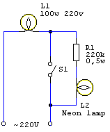 хема предлагаемого устройства собрана всего из двух деталей, собрать ее не составит труда даже начинающему электронщику. В основе схемы (см. рисунок) - неоновая лампа L2. При выключенном светильнике ток проходит через нить накала его лампы L1 и через сопротивление R1, на котором гаситься больше половины напряжение, и поступает на неонку L2. При этом неоновая лампа светиться. Как только контакты выключателя S1 замыкаются неонка гаснет и включается светильник в Вашем коридоре. Неоновая лампа любая, лучше импортного производства (она меньше размером). Сопротивление может отличаться от номинального, от него зависит яркость свечения неонки: чем больше сопротивление - тем меньше яркость и наоборот. Важно, чтобы ваттность сопротивления была не меньше 0.25 Вт (на схеме 0.5 Вт).
