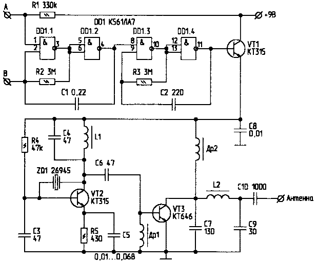 При номиналах элементов генераторов, указанных на схеме, в приемнике слышен сигнал, похожий на сигнал "занято" АТС. Если необходимо иметь постоянный тон, нужно закоротить точки "А" и "В" схемы (когда устройство используется для радиоуправления).