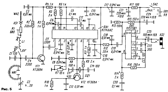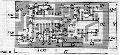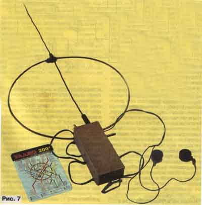 В целях достижения малых габаритов применены элементы для поверхностного монтажа — резисторы Р1-12, конденсаторы К10-17 и транзистор КТ3129Б9. В местах, показанных изогнутыми стрелками, обе стороны платы соединены друг с другом. К плате с помощью коротких проводов припаяно гнездо XS1. После проверки работоспособности и настройки плату покрывают эпоксидным клеем. Батарея GB1 выполнена в виде отдельного модуля и соединена с платой короткими проводами (лучше это сделать через малогабаритный разъем). Радиомаяк должен подавать сигналы с частотой несколько герц, проверить это можно радиостанцией Си-Би диапазона, работающей в режиме SSB. Приемник-пеленгатор может быть различной конструкции. Один из вариантов — использовать в качестве пеленгатора радиостанцию, имеющую режим SSB, со специально изготовленной антенной. Лучше же изготовить специальный приемник-пеленгатор. Приемник (рис. 5) построен по схеме прямого преобразования. Он содержит две антенны: рамочную WA1 и штыревую WA2. На транзисторе VT1 собран УВЧ, а на VT2 — гетеродин с кварцевой стабилизацией частоты. Микросхема DA1 выполняет функции УВЧ с регулируемым коэффициентом передачи, смесителя и предварительного УЗЧ. DA2 — оконечный УЗЧ, который рассчитан для работы на головные телефоны сопротивлением 50... 100 Ом. Резистором R7 регулируют чувствительность приемника (диапазон регулировки — более 30 дБ). Максимальная чувствительность приемника со входа транзистора VT1 составляет около 0,3 мкВ. Большинство деталей приемника размещены на печатной плате (рис. 6) из двустороннего фольги-рованного стеклотекстолита. Вторая сторона оставлена металлизированной (она используется в качестве экрана) и соединена в нескольких местах по краям платы с общим проводом первой стороны. На рис. 7 — фотография приемника. Резистор R7 — СПЗ с выключателем питания, остальные — МЛТ, С2-33. Подстроечный конденсатор С2 — КТ4-25, КТ4-35, оксидные — серий К50, К52, К53, остальные — К10-17, КД. Кварцевый резонатор ZQ1 — на ту же частоту, что и в радиомаяке. Батарея питания GB1 — "Крона", "Корунд", "Ника", 7Д-0,125. Конструкция антенной системы аналогична рекомендуемой, только штыревая антенна сделана съемной. Там же приведено подробное описание ее настройки. Налаживание приемника начинают с установки режима транзистора VT1 по постоянному току.