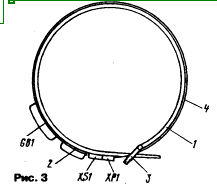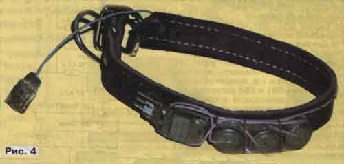 Конструкция радиомаяка показана на рис. 3,а внешний вид — на рис. 4. На самом ошейнике 1 (кожа, ткань) закрепляют плату 2, а батарею, гнездо и вилку крепят таким образом, чтобы при одевании и фиксации ошейника с помощью застежки 3 вилка вставлялась в гнездо и маяк включался. Катушка L1 (поз. 4) выполнена в виде провода диаметром 0,2...0,3 мм в изоляции, закрепленного на ошейнике. При снятии ошейника гнездо и вилка разъединяются и радиомаяк перестает работать. Длина провода катушки L1 определяется длиной ошейника. Налаживают радиомаяк в следующей последовательности. Входы элемента DD1.1 временно соединяют с минусовым выводом источника питания, а параллельно кварцевому резонатору ZQ1 устанавливают конденсатор емкостью 4700 пФ, что переводит устройство в режим генерации на частоте LC-контура. Ошейник одевают на объект, и подбором конденсатора С5 (он располагается непосредственно на вилке) добиваются генерации на частоте, возможно, более близкой к частоте кварцевого резонатора. Контроль надо вести с помощью частотомера, подключив к его входу проводник, находящийся рядом с радиомаяком. После этого временные соединения и детали удаляют.