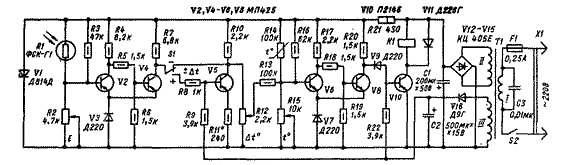 Устройство состоит из блока регулирования температуры, включающего терморезистор R14, транзисторы V6, V8, V10, реле К.1, и блока коррекции температуры, выполненного на фоторезисторе R1 и транзисторах V2 и V4. Оба блока выполнены на основе триггеров Шмигта. Уровень освещенности, определяемый порогом срабатывания блока коррекции, устанавливается резистором R2, а температурный порог второго блока - резистором RJ5. Величина приращения температуры задается резистором R12, а знак приращения выбирается переключателем S1.