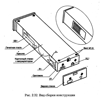 Детали припаиваются со стороны печатных проводников, что позволяет уменьшить толщину корпуса устройства. Трансформаторы Т1 и Т2 приклеиваются к плате эпоксидным клеем. Общий вид сборки всей конструкции (без кожуха) показан на рис. 2.32. На каркасе, образованном из двух плат, закрепленных четырьмя винтами (с потайной шляпкой), обматывается и склеивается кожух из картона (он должен сниматься при снятой задней стенке). Для придания привлекательного внешнего вида кожух обматывается самоклеющейся пленкой под цвет дерева. В месте расположения кнопки SA1 выполняется отверстие в кожухе, а на боковую грань приклеивается накладка из тонкой (1 ...2 мм) пластмассы с прорезями. Внутри гибкой части пластины клеится резиновый вкладыш, но так, чтобы он не мешал одевать кожух на каркас. Настройка схемы заключается в получении (резистором R4) устойчивого запуска и работы автогенератора при питании от стационарного источника с напряжением от 3,9 до 5 В. При настройке схемы лучше использовать блок питания в режиме ограничения тока на 1 А — это предотвратит повреждение VT1 в случае ошибочного подключения фазы первичной обмотки Т1 или же отсутствия режима автогенерации по другой причине. После этого с помощью осциллографа с делителем замеряем напряжение на конденсаторе С4 и подбираем величину зазора в разряднике F1 так, чтобы оно не превышало уровня 650...750 В. Теперь несколько слов об эксплуатации устройства. При переносе электрошока лучше воспользоваться выключателем SA1 для снятия питания — это исключит работу устройства при случайном нажатии кнопки SB1, например в кармане. Не рекомендуется включать электрошок в условиях высокой влажности, чтобы самому не попасть под напряжение дугового разряда. Кроме того, так как для транзистора VT1 не установлен теплоотводящий радиатор (нет свободного места в корпусе), не рекомендуется включать устройство на непрерывную работу в течение времени более 1 мин (обычно в этом и нет необходимости). Следует также знать, что обычная одежда не является препятствием для проникновения дуги.