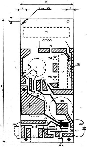 Вид конструкции разрядника F1 приведен на рис. 2.29. В качестве материала лучше взять медные пластины с никелированным покрытием (этим обеспечивается более высокая стойкость разрядника к разрушению дугой). Толщина пластин может быть любой. Пробойное напряжение воздуха примерно 3 кВ на мм (зависит от влажности и атмосферного давления), поэтому зазор разрядника F1 будет примерно 0,1...0,2 мм (регулируется при настройке). Кнопку включения SB1 лучше также сделать самостоятельно — это позволяет учесть особенность конструкции корпуса. Она выполняется из мягкой стальной или медной ленты толщиной примерно 0,5 мм, рис. 2.30. Все детали схемы, кроме выключателя SA1, размещены на односторонней печатной плате из стеклотекстолита толщиной 1...1,5 мм (размером 130x55 мм), рис. 2.31. Таких же размеров плата используется как крышка и элемент крепления выключателя SA1, а также аккумуляторов. Аккумуляторы размещены по двое в картонных стаканах, склеенных по их размерам (по диаметру) и подпружиниваются к основной плате лепестками закрепленными на крышке.