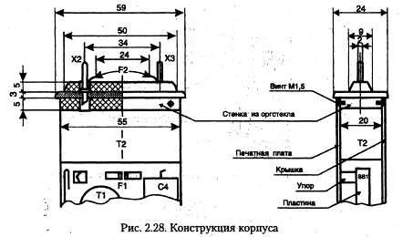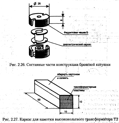При намотке 3-й обмотки необходимо через каж-дые 400 витков укладывать конденсаторную диэлектрическую бумагу, а слои пропитывать конденсаторным или трансформаторным маслом. После намотки катушки вставляем ее в ферритовые чашки и склеиваем стык (предварительно убедившись, что она работает). Места выводов катушки заливаются разогретым парафином или воском. При монтаже схемы необходимо соблюдать полярность фаз обмоток трансформатора, указанную на схеме. Высоковольтный трансформатор Т2 выполнен на пластинах из трансформаторного железа, набранных в пакет, рис. 2.27. Так как магнитное поле в катушке не замкнутое, конструкция позволяет исключить намагничивание сердечника. Намотка выполняется виток к витку (сначала наматывают вторич-ную обмотку) 2 — 1000...2000 витков проводом ПЭЛ диаметром 0,08...0,12 мм (в четыре слоя), 1 - 20 витков диаметром 0,35 мм. Межслойную изоляцию лучше выполнять из несколько витков тонкой (0,1 мм) фторопластовой ленты, но подойдет также и кондёнсаторная бумага - ее можно достать из высоковольтных неполярных конденсаторов. После намотки обмоток трансформатор заливается эпоксидным клеем. В клей перед заливкой желательно добавить несколько капель конденсаторного масла (пластификатор) и хорошо перемешать. При этом в заливочной массе клея не должно быть пузырьков воздуха. А для удобства заливки потребуется изготовить картонный каркас (размерами 55x23x20 мм) по габаритам трансформатора, где и выполняется герметизация. Изготовленный таким образом трансформатор обеспечивает во вторичной обмотке амплитуду напряжения более 90000 В, но включать его без защитного разрядника F2 не рекомендуется, так как при таком напряжении возможен пробой внутри катушки. Защитный разрядник выполняется из двух оголенных проводов, расположенных на расстоянии 20...24 мм. Конструкция электродов Х2, ХЗ и разрядника F2 показана на рис. 2.28. Элементы конструкции крепятся на боковых пластинах из оргстекла толщиной 5...6 мм. В качестве электродов Х2 и ХЗ можно использовать стержни от разъемов на большой ток, например из серии ШР.