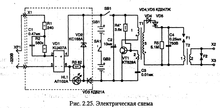 Как только напряжение на конденсаторе С4 (в процессе заряда) достигнет этой величины, разряд конденсатора проходит через F1 и первичную обмотку Т2. Энергия, накопленная на конденсаторе С4 (передаваемая во вторичную обмотку трансформатора), определяется из выражения: W = 0,5С х Uc2 =0,5 х 0,25 х 10-6 х 7002 = 0,061 [Дж] где Uc — напряжение на конденсаторе [В]; С — емкость конденсатора С4 [Ф]. Аналогичные устройства промышленного изготовления имеют примерно такую же энергию заряда или чуть меньше.
