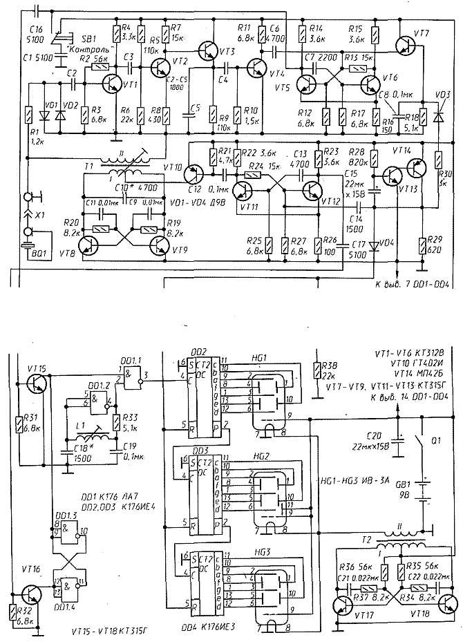 Нити накала люминесцентных индикаторов HG1-HG3 питаются от преобразователя напряжения, выполненного на транзисторах VT17, VT18 и трансформаторе Т2.