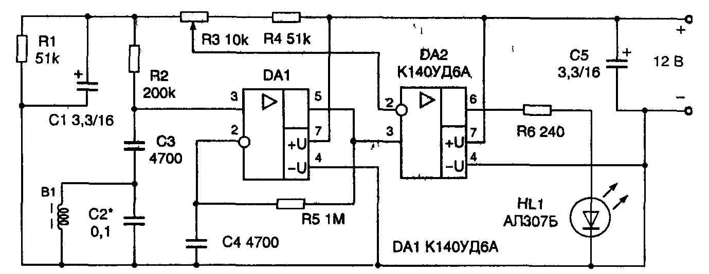 Если датчик расположен вне магнитного поля, амплитуда напряжения на выходе ОУ DA2 мала (шумы и помехи), на выходе компаратора будет постоянное напряжение 1.. 1,5 В. Поэтому светодиод HL1 либо не светится, либо светится слабо — это зависит от свойств конкретного экземпляра ОУ DA2 и свето-диода HL1 Когда датчик приближают к проводнику с током, на выходе усилителя DA1 появляется переменное напряжение, достаточное для переключения компаратора