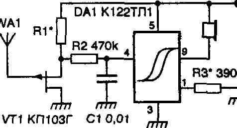 Простой индикатор переменного электрического поля скрытой проводки может быть собран с использованием в качестве регулируемого внешним электрическим полем делителя напряжения — резистора R1 и канала полевого транзистора (рис. 3.21). В качестве управляемого генератора импульсов использован генератор на микросхеме К122ТЛ1. Нагрузкой генератора для индикации являются высокоомные головные телефоны типа ТОН-1 (ТОН-2)
