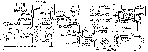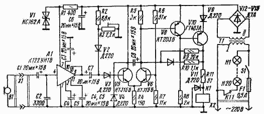 Как только сигнал на входе порогового устройства, со- бранного на транзисторах V5 и V6, достигнет определенного уровня (порог срабатывания задается резистором R3), закроется диод V3, а вслед за ним - транзистор V5. Это приведет к закрыванию транзистора V10, в коллекторную цепь которого включено реле К1. Реле обесточивается, и его нормально замкнутые контакты подключают сигнальное табло (лампы HI-Н20). Время сигнализации определяется постоянной времени цепи С8, R10, R11, К1.