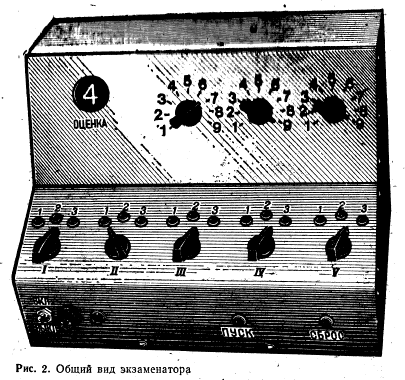 Далее ждущий мультивибратор снова переходит в устойчивое состояние, когда транзистор V9 открыт, и дальнейшее прохождение импульсов генератора на вход блока D3 прекращается. Блок D3 состоит из счетчика импульсов на трех счетных транзисторных триггерах (V34, V35), электронных ключей (V28, V29, V31—V33) и газоразрядного цифрового индикатора (H1). Электронные ключи собраны по схеме, соответствующей принципу «чет-нечет». Дешифратор блока — диодно-резистивный (V30, R36, R37, R41). Цифровой индикатор высвечивает цифру, т. е. оценку знаний экзаменуемого, соответствующую числу импульсов, поступивших на вход блока. При отпускании кнопки S1 вновь открываются транзисторы V5 и V11, срабатывает реле К1, размыкаются контакты K1.1 и замыкаются К1.2. Теперь никакие повторные нажатия на кнопку S1 не изменят состояния устройства. На панели прибора загораются лампы, указывающие положения переключателей S7—S11, соответствующие правильным ответам. После нажатия на кнопку S2 «Сброс» экзаменатор готов к проверке знаний очередного учащегося. Коммутация блока Е1 выполнена так, что первые два вопроса шифруются одним переключателем S4, третий вопрос —переключателем S5, а два последних — переключателем S6. Для шифровки вопросов билета удобно пользоваться специально составленной таблицей, которая должна храниться у преподавателя. Один из возможных вариантов такой таблицы представлен ниже. Предположим, что порядок правильных ответов на вопросы какой-либо карты установлен следующий: на I вопрос — 2 (т. е. правильный ответ — второй из трех), на II —3, на III —2, на IV — 1 и на V — 3. Такой комбинации соответствует для переключателя S4 положение 6 (см.таблицу), для S5 — одно из трех: 2, 5 или 8 и для S6— 3. Таким образом, шифр вопросов этой карты может быть одним из трех: 623, 653 или 683. Для получения оценки «отлично» переключатели ввода ответа S7 — S11 должны'быть установлены в положения 2, 3, 2, 1 и З соответственно. При этом все пять конденсаторов С17— С21 будут включены параллельно и число импульсов, прошедших на вход блока D3, будет максимальным. Другими словами, шифром правильного ответа на этот билет будет 23213. Шифр указывают на-каждой карте. В экзаменатор шифр вводит (устанавливает переключатели S4—S6 в соответствующие положения) либо преподаватель, либо сам экзаменующийся. Половина секций переключателей S4—S6 служит для коммутации ламп, указывающих правильные ответы. В режиме «Повторение», когда прибор должен в нужный момент подсказать правильные ответы, кодирование вопросов и ввод ответов производят при выклю ченном сетевом выключателе. Правильность ответа проверяют включением экзаменатора в сеть по загоревшимся лампам. В случае неверного ответа на какой-либо вопрос вращением ручки соответствующего переключателя находят положение, при котором загорается лампа данной группы. Блок питания экзаменатора содержит два стабилиза-тоpa на напряжения 23 и 10 В и выпрямитель для пи-тания цифрового индикатора. Все лампы накаливания в приборе питаются от одной обмотки трансформатора Т2. Прибор смонтирован в металлическом корпусе. Органы управления расположены спереди. Вид прибора показан на рис. 2. Трансформатор Т2 собран на маг-нитопроводе сечением 4 см2. Обмотки содержат: I — 2640 витков провода ПЭВ-1 0,12, II — 300 витков провода ПЭВ-1 0,29, III—120 витков провода ПЭВ-1 0,29, IV — 1800 витков провода ПЭВ-1 0,12 и V — 240 витков провода ПЭВ-1 0,59