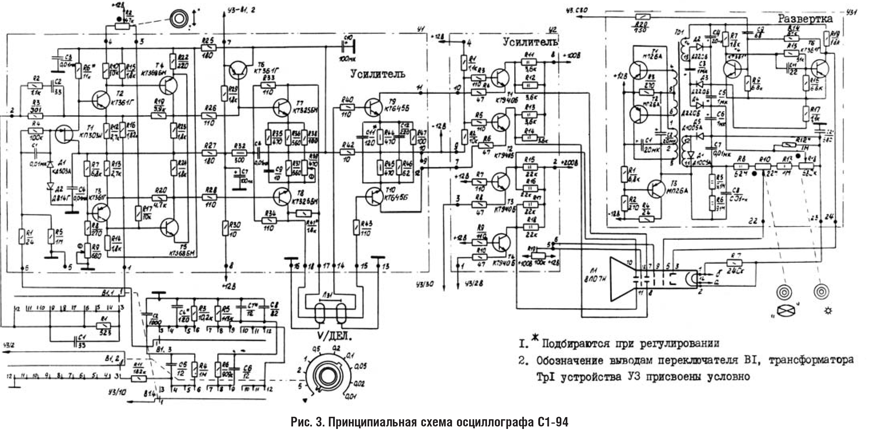 Низковольтный источник предназначен для питания всех функциональных устройств напряжениями +24 В и ± 12 В. Рассмотрим работу осциллографа на уровне принципиальной схемы (рис. 3).