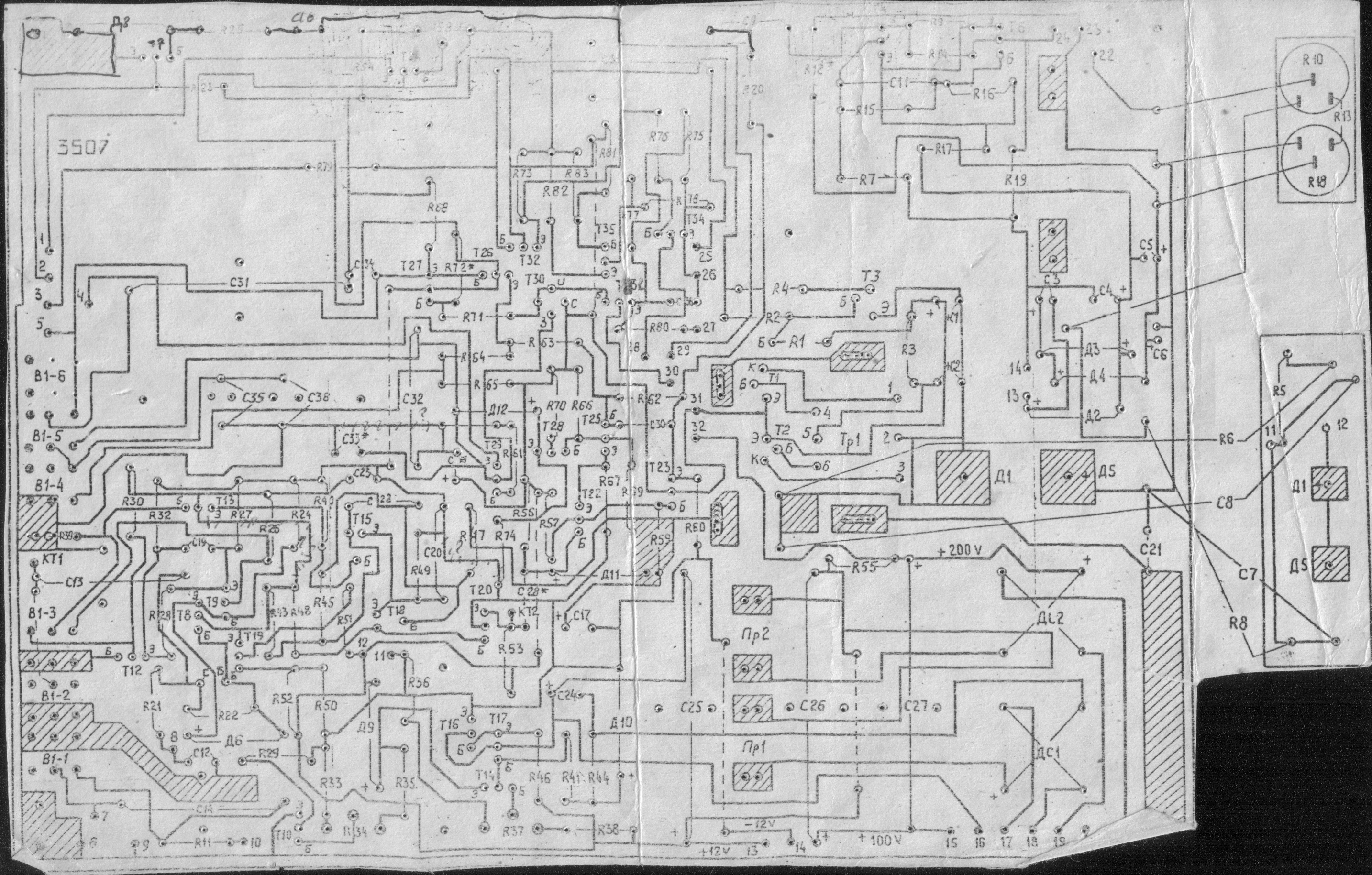 Напряжения источников 100 В и 200 В не стабилизированы и снимаются со вторичной обмотки силового трансформатора Tpl через схему удвоения ДС2-УЗ, С26-УЗ, С27-УЗ. Напряжения источников +12 В и -12 В стабилизированы и получаются из стабилизированного источника 24 В. Стабилизатор на 24 В выполнен на транзисторах Т14-УЗ, Т16-УЗ, Т17-УЗ. Напряжение на вход стабилизатора снимается со вторичной обмотки трансформатора Tpl через диодный мост ДС1-УЗ. Подстройка стабилизованного напряжения 24 В производится резистором R37-y3, выведенным под шлиц. Для получения источников +12 В и -12 В в схему включен эмиттерный повторитель Т10-УЗ, база которого питается от резистора R24-y3, которым осуществляется подстройка источника +12 В.