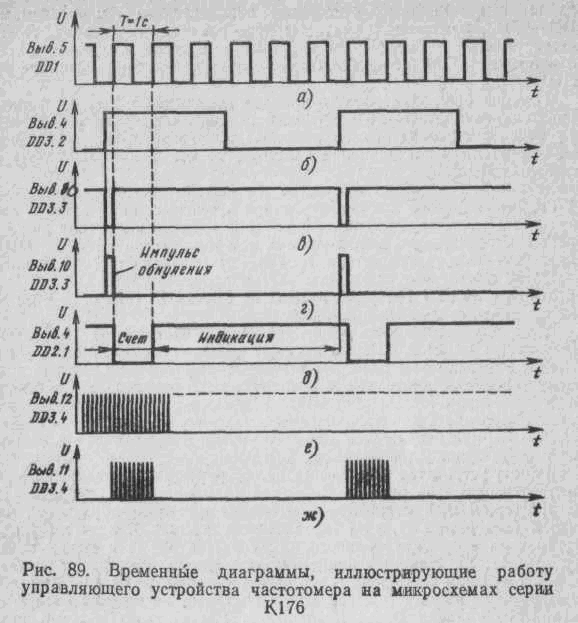 Функцию генератора импульсов и делителя частоты до значения 1 Гц, необходимого для формирования временных интервалов и импульсов обнуления счетчика по окончании времени индикации результата измерения, выполняет знакомая вам микросхема К176ИЕ5 DD1. Исходная частота генератора (32 768 Гц) определяется собственной частотой кварцевого резонатора ZQ1 и конденсаторами СЗ, С4. Частота импульсов 1 Гц, формируемых на выходе 15 (вывод 5) этой микросхемы, и служит образцовой. Узел управления цикличной работой частотомера образуют D-трштеры DD2.1 и DD2.2 и логические элементы 2ИЛИ-НЕ DD3.1, DD3.2. Эти элементы работают в генераторе импульсов запуска времени индикации, длительность которых можно регулировать переменным резистором R9. Элемент DD3.3 используется в качестве ключа в цепи обнуления счетчика. Напомним логику действия элемента 2ИЛИ-НЕ: при напряжении высокого уровня на любом из его входов на выходе будет напряжение низкого уровня. Работу устройства управления иллюстрируют временные диаграммы, показанные на рис. 89. С выхода 15 микросхемы DD1 на вход С триггера DD2.2 непрерывно поступают импульсы образцовой ча¬стоты (диаграмма а), а на такой же вход триггера DD2.1—импульсы генератора запуска, собранного на элементах DD3.1 и DD3.2 (диаграмма б). За исходный примем момент, когда оба триггера находятся в нулевом состоянии. В это время напряжение высокого уровня с инверсного выхода триггера DD2.2 поступает на нижний вход электронного клапана DD3.4 и закрывает его. С этого момента пре¬кращается прохождение через клапан импульсов сигнала измеряемой частоты на вход счетчика DD4—DD8.