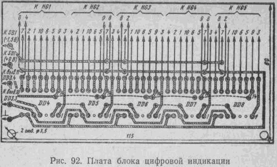 Внешний вид этого варианта частотомера и размещение деталей в его корпусе показаны на рис. 90. Через прямоугольное окно в лицевой панели, прикрытое изнутри пластиной из зеленого прозрачного органического стекла, видны светящиеся цифры индикаторов. На правой половине лицевой панели ручка переменного резистора R9 генератора импульсов запуска и кнопочный выключатель питания SB1. Входные гнезда XS1 и XS2 расположены слева внизу. Все другие детали прибора смонтированы на двух печатных платах размерами 115X60 мм из фольгированного стеклотекстолита толщиной 1 мм. На одной из них (рис. 91) смонтированы все детали, относящиеся к формирователю импульсного напряжения, источнику образцовой частоты и устройству управления, на другой (рис. 92) — счетчики DD4—DD8 и цифровые индикаторы HG1—HG5. Проволочные выводы индикаторов, баллоны которых размещены вертикально, припаяны к контактным площадкам у выходов счетчиков (на рис. 92 выводы обозначены стрелками). На первой из этих плат расстояние между рядами отверстий микросхемы DD3 увеличено до 12 мм. Кро¬ме деталей, на этой плате надо установить пять проволочных перемычек (на рис. 91 они показаны штриховыми линиями).