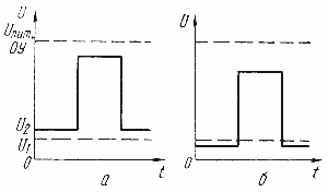 При снятии осциллограммы в точке "а" видно, что минимальное напряжение (U2, рис.2,а) генерируемых импульсов слишком велико но абсолютному значению, чтобы закрыть транзистор структуры n-p-n (в зависимости от серии ОУ это напряжение может достигать значения 2 В): U2 > U1, где U1 - пороговое значение напряжения, при котором эмиттерный переход транзистора открывается. Поэтому, несмотря на то, что генератор работает (т.к. микросхема исправна), транзистор VT1 постоянно открыт, а светодиод HL1 горит, указывая на негодность микросхемы.