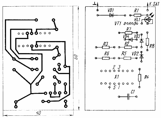 Детали устройства размещают на печатной плате (рис.3), выполненной из одностороннего фольгированного стеклотекстолита толщиной 1...1.5 мм.