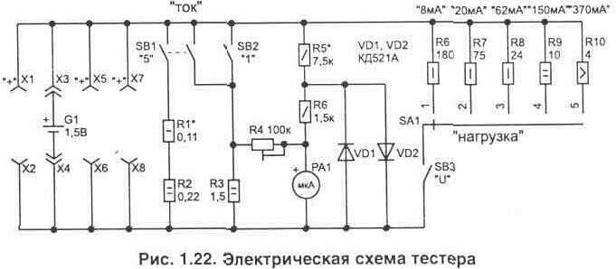 Простейшее устройство, рис. 1.22, предназначено для быстрой проверки напряжения и емкости, что дает возможность легко оценить качество приобретаемого гальванического элемента питания или степень заряда аккумулятора с номинальным напряжением 1,2...1,5 В. Это позволит в магазине выбрать батарейку, которая прослужит значительно дольше, а также выявить явный и скрытый брак. Следует знать, что аккумуляторы обычно продаются в магазине не заряженными и их нужно проверять уже после зарядки. Для удобства подключения устройство имеет четыре пары контактных зажимов Х1...Х8 под установку разных типоразмеров элементов питания: миниатюрных гальванических для часов, R6 (элемент 316), R14 (343) и R20 (373). Конструкция зажимов зависит от того, с какими элементами чаще всего приходится иметь депо (их можно приобрести уже готовые). Пользоваться устройством довольно просто. Схема состоит из измерителя напряжения и тока. При установке проверяемого элемента (соблюдая полярность) в соответствующие зажимы стрелочный измерительный прибор РА1 будет показывать напряжение "холостого хода". Для новой батарейки оно должно быть около 1,5 В (у заряженного аккумулятора 1,2...1.5 В). При помощи переключателя SA1 ("нагрузка") устанавливаем нужную нагрузку для конкретного элемента и нажимаем кнопку SB3 (U). Прибор РА1 будет показывать напряжение на элементе в рабочем состоянии. Оно не должно сильно уменьшаться по сравнению с предыдущим режимом. Номиналы сопротивлений R6...R10 подбираются с учетом максимального допустимого тока через элементы. -начение разрядного тока в цепи выбраны из условия не более 0,1Q, где Q - энергоемкость, выраженная в ампер-часах. Так как на самом элементе часто не указывают энергоемкость, то, чтобы сориентироваться, какую нагрузку следует использовать, можно воспользоваться табл. 1.1. Более подробная информация по гальваническим источникам питания и их особенностях приведена в литературе [например, Л24 стр. 220; Л25; Л26]. Энергоемкость у элемента можно проверить при помощи двух кнопок "ток". При нажатии кнопки SB1 или SB2 индикатор РА1 работает как амперметр со шкалой измерения 5 или 1 А соответственно. Обычно приходится пользоваться кнопкой SB2 (шкала 1 А) для проверки миниатюрных элементов, применяемых в часах. По показаниям тока легко оценить реальную емкость заряда у элементов и сравнивать их между собой. При этом если ток начинает сильно "ползти" вниз (уменьшаться) - это говорит о браке. Такой элемент долго работать не будет. Диоды VD1, VD2 предотвращают повреждение стрелочного индикатора при неправильной полярности подключения гальванического элемента. В качестве индикатора РА1 можно использовать стрелочный микроамперметр с током полного отклонения 150 или 100 мкА, например М4247, М4248. Подойдет также любой другой малогабаритный индикатор от бытовых приборов, например М476.