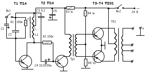 Схема генератора приведена на рисунке. Задающий генератор с модулятором собран на транзисторе Т1. При разомкнутом выключателе Вк1 транзистор Т1 с контуром L1C3 в цепи коллектора и элементами R1C2 в цепи базы работает как генератор, собранный по индуктивной трехточечной схеме с рабочей частотой 1кгц. Модуляция передатчика с частотой 2-3гц осуществляется включением тумблера ВК1. Подключение емкости С1 резко увеличивает постоянную времени базовой цепи, вследствие чего генератор начинает работать в режиме рперывистой генерации. Каскад на транзисторе Т2 является буферным между генератором и мощным двухтактным выходным каскадом, собранным на транзисторах Т3, Т4. Резистор R2 устанавливает рабочую точку транзистора Т2 по току, величина которого при отключенном транзисторе Т1 составляет 8-10ма. Резисторы R4 и R5 устанавливают необходимый начальный режим транзисторов выходного каскада. Секционированная обмотка выходного трансформатора позволяет согласовать выход генератора с нагрузкой в 1-2ом, 50ом и 200ом. Выходная мощность генератора составляет 5-8вт. Для питания генератора применяется аккумуляторная батарея напряжением 24в. Ток потребления до 1а.