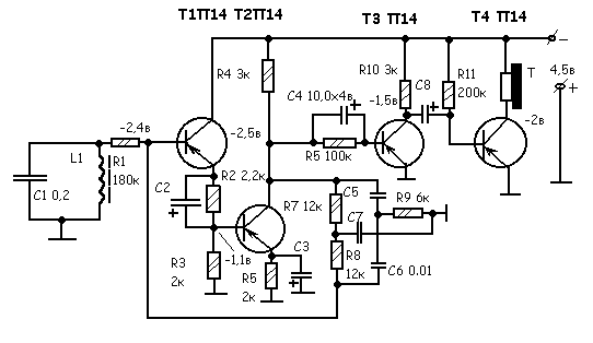 Схема приемника приведена на рисунке. Антенный контур L1C1 настроен на частоту генератора. Напряжение звуковой частоты поступает через резистор R1 на вход усилителя, собранного на четырех транзисторах.