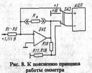 Принцип работы омметра проиллюстрирован функциональной схемой на рис. 8. Измеряемое сопротивление включено в цепь обратной связи операционного усилителя DA2, входной ток которого задан резисторами R1 - R6, подключенными через переключатели SA2.2 и SA1.3 к источнику напряжения +1,111 В. Поскольку сопротивления используемых резисторов R1 - R6, включенных последовательно, кратны 1,111кОм, ток, задаваемый ими, имеет значения, кратные 10, и падение напряжения на измеряемом сопротивлении с точностью до множителя 10° равно его величине. Это падение напряжения на основных диапазонах (множитель "х1") измеряется с помощью АЦП, подключенного непосредственно к измеряемому сопротивлению. При введении множителя "х10" падение напряжения на измеряемом резисторе с помощью делителя R16R17R18 перед подачей на АЦП уменьшается в 10 раз. Такое построение омметра позволяет использовать те же резисторы, что и в делителе вольтметра и исключает их подбор. Кроме того, дрейф нуля операционного усилителя не приводит к дрейфу нуля омметра на основных диапазонах и уменьшается в 10 раз при введении множителя "х10".