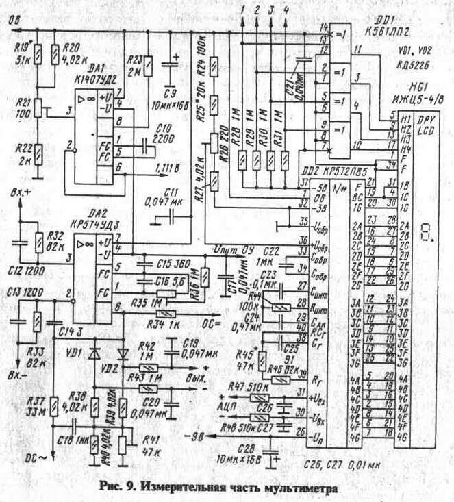 Основным отличием предлагаемого прибора от ранее описанного автором [2, 3] является малое потребление тока от батареи питания, что определяется использованием рассмотренной выше микросхемы КР572ПВ5 и жидкокристаллического индикатора. Кроме того, в нем расширен диапазон измеряемых сопротивлений до 19,99 МОм и возможен контроль р-n переходов различных полупроводниковых приборов, что не может обеспечить большинство других цифровых мультиметров.