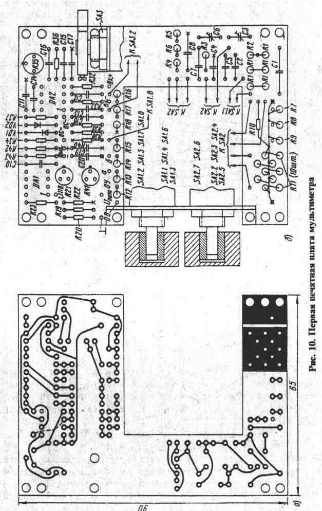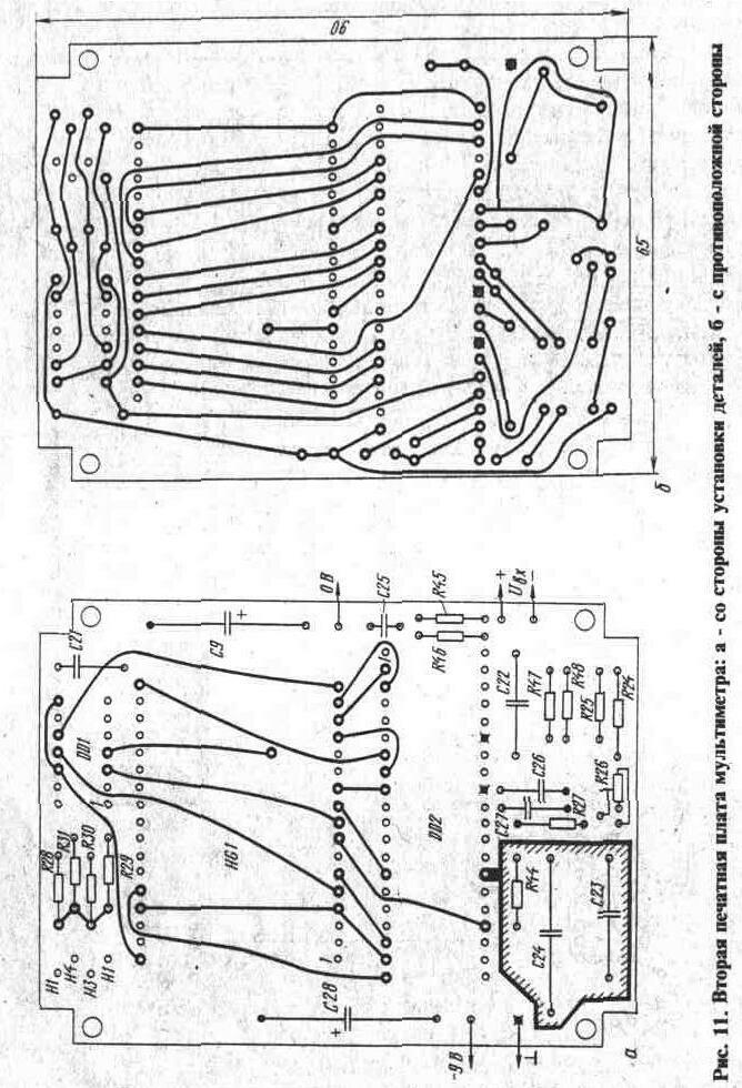 Все детали мультиметра, кроме батареи питания, расположены на двух печатных платах размерами 65х90 мм. На первой односторонней плате установлены все детали мультиметра, за исключением микросхем DD1, DD2, индикатора HG1 и непосредственно связанных с ними деталей - они расположены на второй плате. На рис. 10 приведено расположение проводников и деталей на первой плате со стороны, противоположной стороне установки элементов. Вторая плата - двусторонняя. На рис. 11,а показано расположение деталей и проводников на стороне установки деталей, а на рис. 11,б -с противоположной стороны.