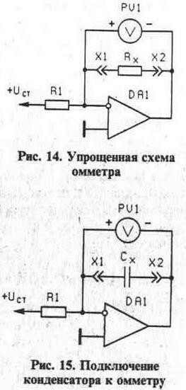 Описанный выше мультиметр в режиме омметра позволяет измерять емкость конденсаторов. Рассмотрим упрощенную схему омметра мультиметра (рис. 14). Измеряемый резистор включен в цепь обратной связи операционного усилителя DA1, инвертирующий вход которого подключен к источнику стабильного напряжения Uст через токозадающий резистор R1. В результате на вольтметр PV1 поступает напряжение U, пропорциональное измеряемому сопротивлению Rx и определяемое по формуле: