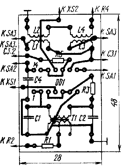 Каскад на элементе DD1.4, как и в предыдущем генераторе аналогичный каскад, формирует прямоугольные импульсы, поступающие на выходное гнездо XS2. Чтобы сигнал РЧ промодулировать сигналом ЗЧ, нужно установить переключатель SA1 "Модуляция" в положение "Вкл.". Тогда сигнал с выхода генератора ЗЧ (точнее с выхода согласующего каскада) будет поступать на один из входов элемента DD1.3 и периодически (с частотой следования импульсов ЗЧ) разрешать или запрещать работу генератора РЧ, обеспечивая тем самым амплитудную модуляцию колебаний РЧ. Питается генератор от источника напряжением 9 В - от батареи "Крона" либо от двух батарей 3336, соединенных последовательно. Питание подается на генератор выключателем SA2. Кроме указанной на рис.1, в генераторе можно применить микросхемы К176ЛА7, К561ЛА7, К564ЛА7. Подойдет и микросхема К561ЛЕ5 или К564ЛЕ5, но для нормальной работы каскада на элементе DD1.3 левый по схеме контакт переключателя SA1 должен быть соединен не с плюсовым, а с минусовым ("общим") проводом питания. Конденсатор переменной емкости - типов КПТМ, КПЕ или другой малогабаритный с указанными на схеме или большими пределами изменения емкости; остальные конденсаторы могут быть КЛС, КМ, МБМ. Переменные резисторы R2, R4-типа СПО или СП, постоянные - МЛТ-0,125. Трансформатор Т1 - унифицированный выходной трансформатор (в качестве обмотки I используется половина первичной обмотки) от малогабаритного транзисторного радиоприемника. Катушки намотаны на двух каркасах контурных катушек ПЧ радиоприемников "Сокол", "Соната" либо на других малогабаритных каркасах с подстроечником из феррита. Катушки L1 и L2 намотаны на одном каркасе и содержат 490 и 40 витков соответственно провода ПЭВ-1 0,06. Катушки L3 и L4 намотаны на другом каркасе и содержат соответственно 240 и 22 витка провода ПЭВ-1 0,1. Часть деталей генератора монтируют на плате (рис.2) из фольгированного стеклотекстолита. Плату с источником питания укрепляют внутри корпуса подходящих габаритов. На лицевой стенке корпуса крепят переменные резисторы и конденсатор, выключатель питания и переключатели рода работы, а на боковой (можно и на лицевой) - гнезда XS1-XS5. Если ошибок в монтаже нет, генератор начинает работать сразу после подачи питания. Контролировать его работу лучше всего с помощью осциллографа, подключаемого сначала к гнездам XS5 ("земляной" щуп) и XS4 (входной щуп), а затем - к гнездам XS5 и XS3. Подбором резисторов R3 и R5 добиваются устойчивой генерации и неискаженной синусоиды (для генератора РЧ - во всем диапазоне частот). Остается проверить с помощью частотомера или образцового генератора границы поддиапазонов, установить их с помощью подстроечников катушек, а затем отградуировать шкалу конденсатора переменной емкости.