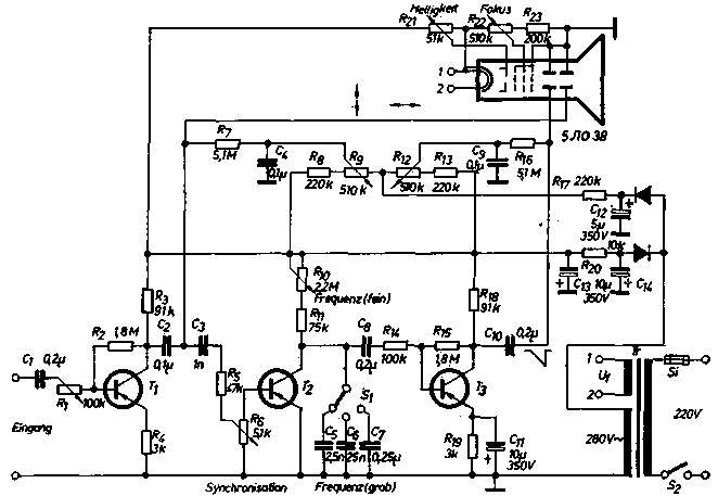 Используя транзисторы в так называемом лавинном режиме (Радио № 9, 1972г.), можно сделать простой осциллограф для наблюдения за низкочастотными процессами в диапазоне от 30 Гц до 20 КГц.