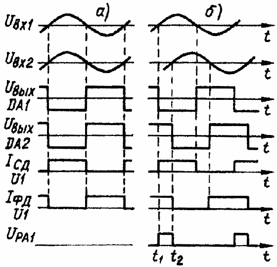Предположим, что угол сдвига фазы входных сигналов равен нулю (рис.2, а). Тогда в отрицательный полупериод выходного напряжения компаратора DA1 открывается транзистор VT1 и в цепи светодиода оптрона U1 протекает ток. Отрицательное выходное напряжение компаратора DA2 приложено к диоду VD5 в обратном направлении, поэтому ток в цепи микроамперметра РА1 не протекает.