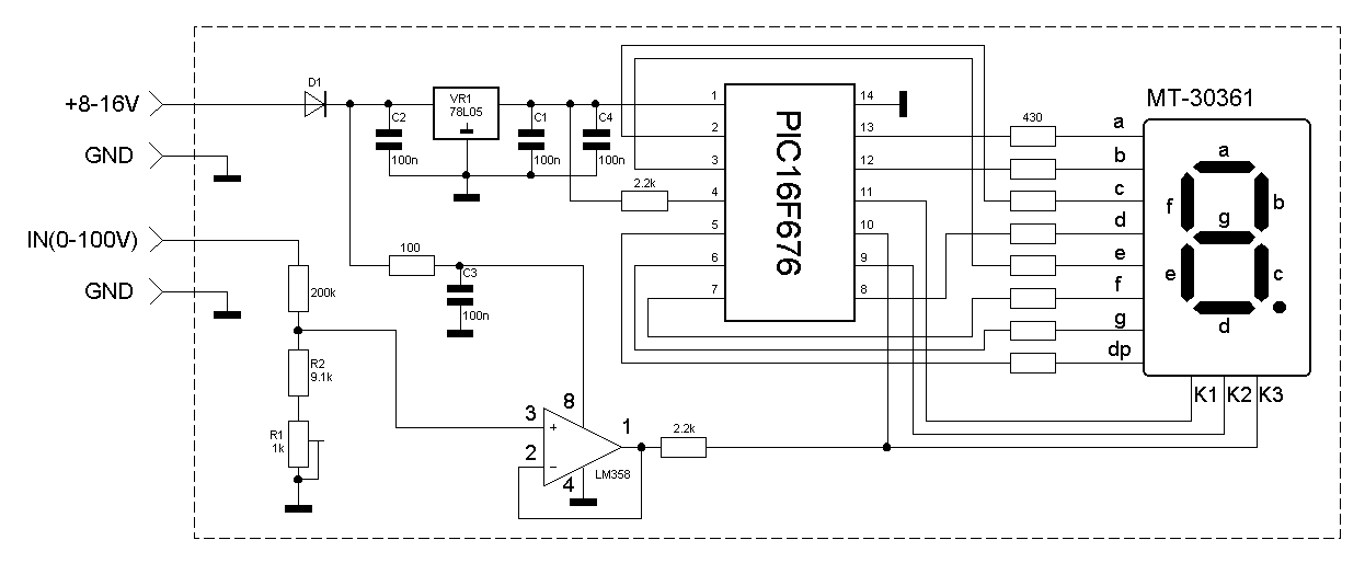 Вольтметр предназначен для индикации постоянного напряжения в диапазоне от 0 до +100В. В зависимости от входного делителя и прошивки микроконтроллера диапазоны измерений могут быть 0..+1В, 0..+10В, 0..+999В.