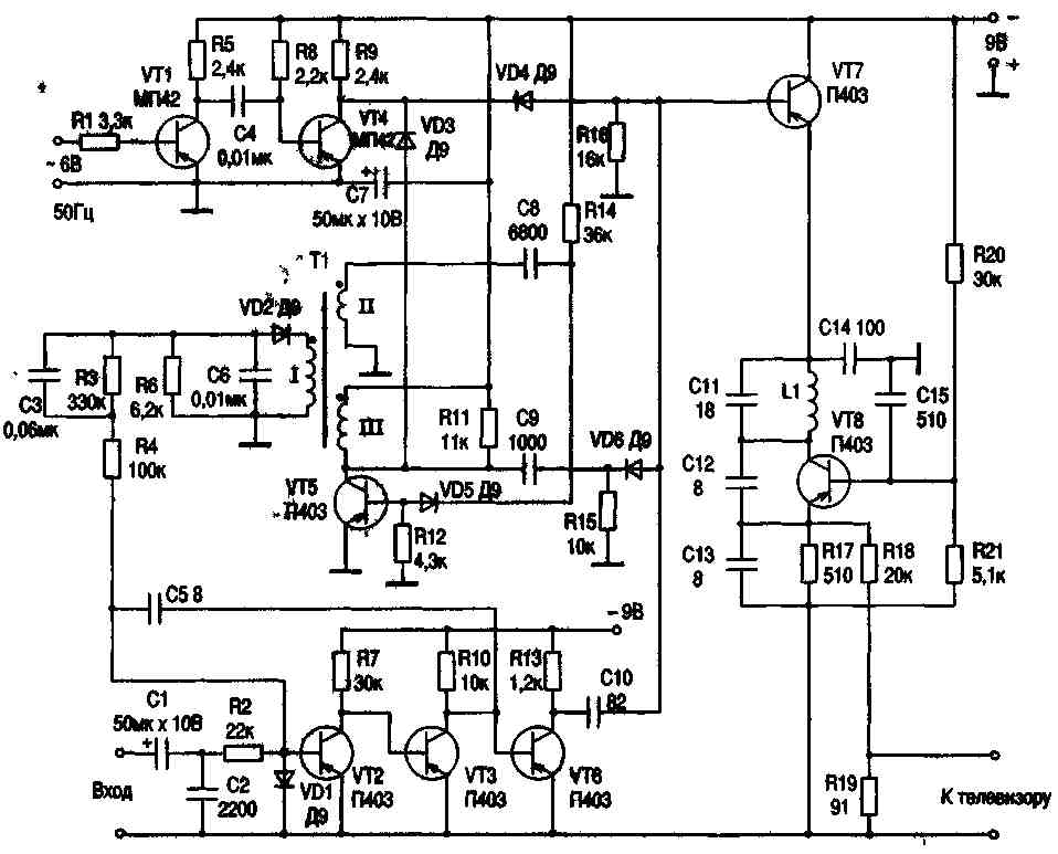 Приставка (см. рисунок), превращает любой телевизор в осциллограф с большим экраном. На нем можно наблюдать НЧ колебания, а с помощью генератора качающей частоты (ГКЧ) визуально настраивать усилители ПЧ радиоприемников. Приставку можно рассматривать как миниатюрный телевизионный передатчик. Несмотря на относительно простую схему, в этом передатчике формируется полный телевизионный сигнал, который отличается от стандартного только отсутствием уравнивающих импульсов. Кадровые синхроимпульсы формируются из эталонного синусоидального напряжения усилителем-ограничителем VT1, дифференцирующей цепью R8C4 и пороговым усилителем на VT4. Их длительность около 1,9 мс. Блокинг-генератор (на транзисторе VT5) генерирует строчные синхроимпульсы. Это неосновные импульсы блокинг-генератора, а выбросы коллекторного напряжения, возникающие сразу вслед за основными. Между коллекторами транзисторов VT4 и VT5 включен разделительный диод VD3. В момент генерации основного импульса коллектор транзистора VT4 замыкается на шасси через открытый транзистор VT5 и диод VD3. Вследствие этого в кадровых синхроимпульсах появляются врезки, которые, как и требуется, предшествуют строчным синхроимпульсам. Обмотки трансформатора VT1 блокинг-генератора намотаны на тороидальном сердечнике из оксиферита(Ф-1000) Внешний диаметр сердечника 10 мм, толщина 2 мм. Обмотки I и III содержат по 100 витков, а обмотка II - 30 витков провода ПЭЛШО o0,1. В начале периода строчной развертки импульс напряжения блокинг-генератора быстро заряжает конденсатор С6 через диод VD2. В течение остальной части периода он медленно разряжается через резистор R6. Возникающее при этом пилообразное напряжение поступает на базу транзистора VT2. Здесь оно складывается с входным напряжением. Трехкаскадный усилитель из-за большого коэффициента усиления (50000-100000) работает практически в релейном режиме, характеризующемся определенным порогом срабатывания. Параметры приставки выбраны такими, что при отсутствии исследуемого напряжения осевая линия находится в центре экрана. При необходимости изображение на экране можно сдвинуть в ту или иную сторону изменением сопротивления резистора R3. Для повышения четкости изображения линии на экране телевизора усилитель (VT2, VT3, VT6) охвачен положительной обратной связью с коллектора транзистора VT3 на базу транзистора VT2 через конденсатор С5. Это значительно повышает усиление в области высоких частот и, следовательно, увеличивает крутизну фронта выходных импульсов. Визуально это проявляется в повышенной резкости перехода от белого к черному. Кадровые, строчные и видеоимпульсы складываются на входе эмитерного повторителя VT7, который является модуляционным усилителем УКВ генератора VT8. Последний собран по схеме емкостной трехточки. Частота генерации должна быть выбрана равной несущей частоте изображения свободного телевизионного канала. В противном случае приставка может создавать помехи работе соседних телевизоров. Требуемые частоты генерации можно получить, подбирая число витков катушки L1.