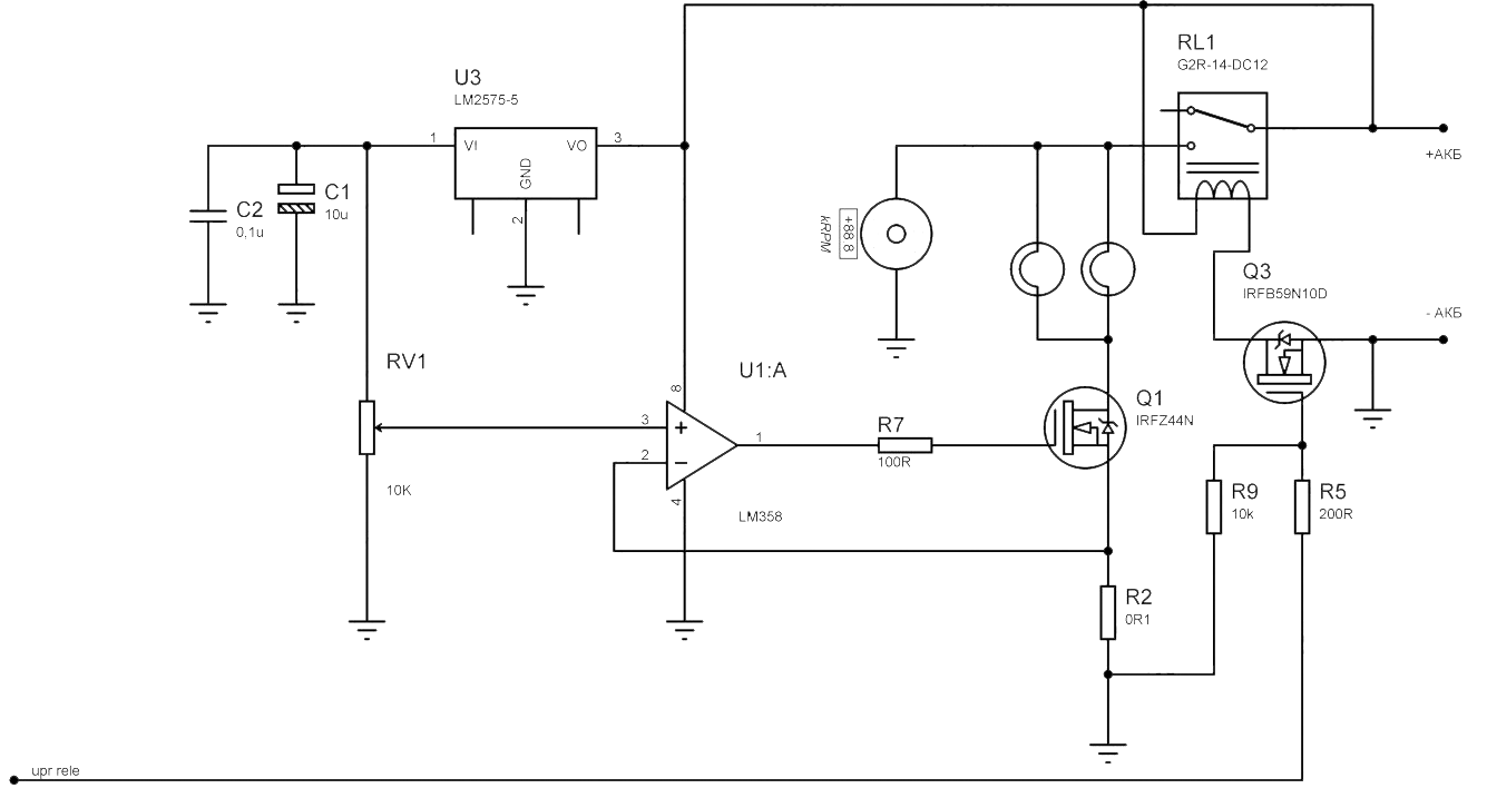 Контроллер считывает напряжение на аккумуляторе и если напряжение выше 11в — включает реле К1 (RL1) подключая разрядную нагрузку (2 лампы Н4).