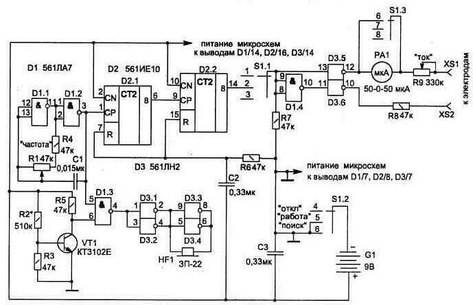 В схеме применены переменные резисторы типа СП2-2-0.5 , а остальные резисторы - С2-23, конденсаторы типа К10-17. Микроамперметр РА1 со шкалой 50-0-50 мкА, например типа М4247 (нуль в середине шкалы). Пьезоизлучатель HF1 заменяется на -П-3, -ГИ 8 или аналогичный. Переключатель S1 - ПГ2-18--П4Н .