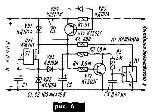 Блокиратор "пиратского" телефона Блокиратор "пиратского" телефона предохраняет телефонную линию абонента от несанкционированного подключении "пиратского" телефона. Когда трубка лежит на аппарате, напряжение в линии составляет 60 В, и через стабилитрон VD4 в базу транзистора VT2 течет ток, VT2 - открыт (рис.6). При снятой трубке напряжение в линии падает до 5-15 В - стабилитрон VD4 закрывается. Если трубка снята хозяином (т.е. после блокиратора), открывается VT1, коллекторный ток которого поддерживает в открытом состоянии VT2. На его коллекторе и управляющем входе ключа К1 - низкий уровень. Ключ закрыт и линия не шунтируется.