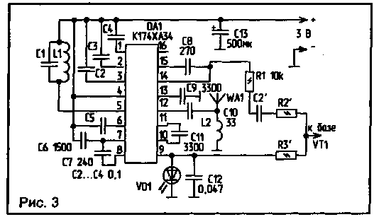 Экономичный приемник с низковольтным питанием можно собрать на микросхеме К174ХА34 по схеме, приведенной на рис.3. При ее отсутствии можно использовать готовый миниатюрный приемник с выходом на телефон. Размеры платы таковы, что позволяют свободно установить ее в трубке радиотелефона. Такой же приемник, но на диапазон 65...74 МГц, можно использовать и для стационарного аппарата. Приемник потребляет небольшой ток, поэтому его можно питать от телефонной линии. Но так как размеры приемника для стационарного аппарата некритичны, для этой цели можно использовать переносной приемник со встроенным блоком питания типа "Океан".