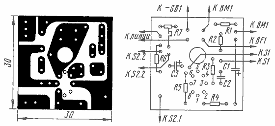 Немного о конструкции и деталях ПУ. Печатная плата (рис.3) для усилителя выполнена из одностороннего фольгированного стеклотексголита толщиной 1,5 мм.