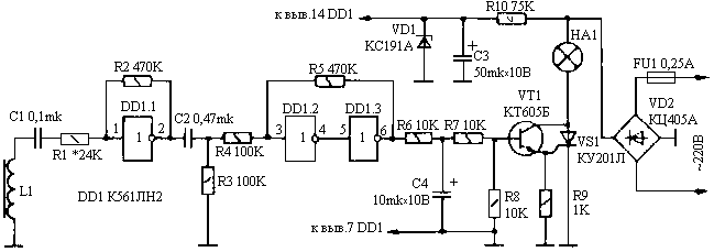 Предназначенный для людей с пониженным слухом, он обеспечивает появление светового сигнала при поступлении вызова к абоненту (рис.1). Индуктивный датчик L1 располагают в магнитном поле катушки звонка телефонного аппарата. Создаваемое им переменное напряжение через разделительный конденсатор С1 поступает на вход усилителя на логическом элементе DD1.1, работающем в аналоговом (линейном) режиме. Такой режим достигается введением отрицательной обратной связи по постоянному току через резистор R2. Усиленный в десятки раз сигнал через дифференцирующую цепь С2 R3 поступает на формирователь - триггер Шмитта, выполненный на логических элементах DD1.2, DD1.3. С выхода триггера Шмитта сигнал поступает (через резисторы R6, R7) на базу высоковольтного транзистора VT1, включенного в цепи управляющего электрода тринистора VS1. Особенность такого способа включения транзистора ? незначительная рассеиваемая на нем мощность. Это объясняется тем, что после открывания тринистора напряжение между коллектором и эмиттером транзистора уменьшается до 1..2 В, и ток через него практически прекращается. Тринистор управляет нагрузкой - осветительной лампой НА1, которая и сигнализирует о поступающем вызове к абоненту.