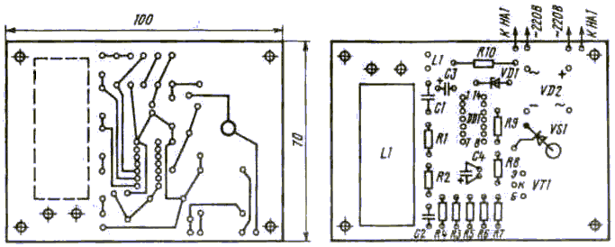Телефонный световой сигнализатор монтируют на плате из фольгированного стеклотекетолита (рис.2). Плату размещают в корпусе размерами 210х140х40 мм в виде подставки под телефон. Катушка-датчик L1 должна находиться на расстоянии не более 50...70 мм от обмотки звонка телефонного аппарата.
