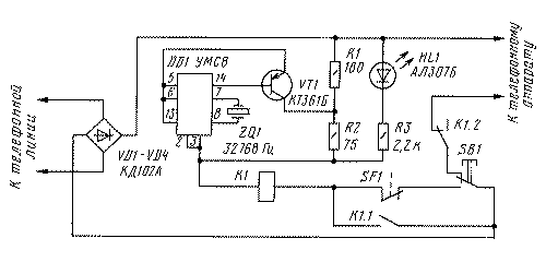 В качестве SF1 можно использовать микропереключатель МП или геркон, управляемый магнитом (магнит должен быть приклеен к рычагу ТА). Кнопка SB1 - КМ1.1, светодиод HL1 - любой из серии АЛ307. Диоды VD1-VD4 - любые, допускающие обратное напряжение не менее 200 В. Реле K1 - РЭС-47 (паспорт РФ4.500.409, РФ4.500.431 или РФ4.500.432).