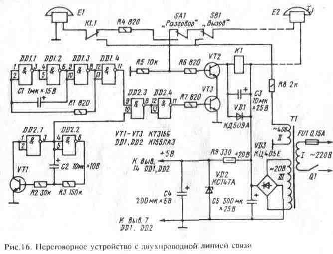 После того, как абоненты снимают трубки с аппаратов Е1 и Е2, можно вести разговор. При этом аппараты соединены параллельно и через резистор R5 подключены к источнику напряжения (мостовой выпрямитель VD3 и конденсатор СЗ). Наличие резистора R5 обеспечивает передачу разговорного тока От одного абонента к другому и ограничивает ток через открытый транзистор VT2.