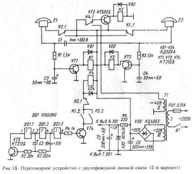 На рис. 20 представлена схема еще одного, третьего, варианта переговорного устройства с двухпроводной линией связи. Это устройство работает следующим образом.