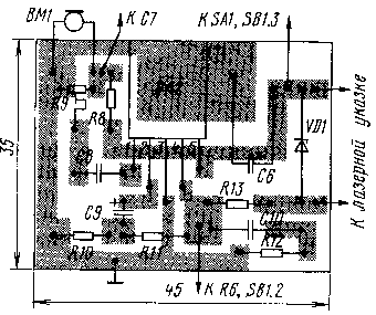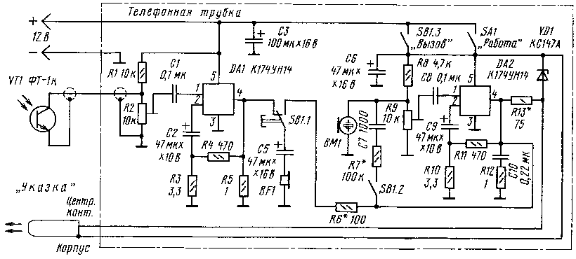 Налаживание устройства начинают с того, что временно отключают цепочку C7R7 и указку. Включают оба узла и проверяют работоспособность микросхем измерением напряжения на их выходах - оно должно быть равно примерно половине напряжения питания. На фототранзисторе и микрофоне напряжение должно быть в пределах 4...8 В.